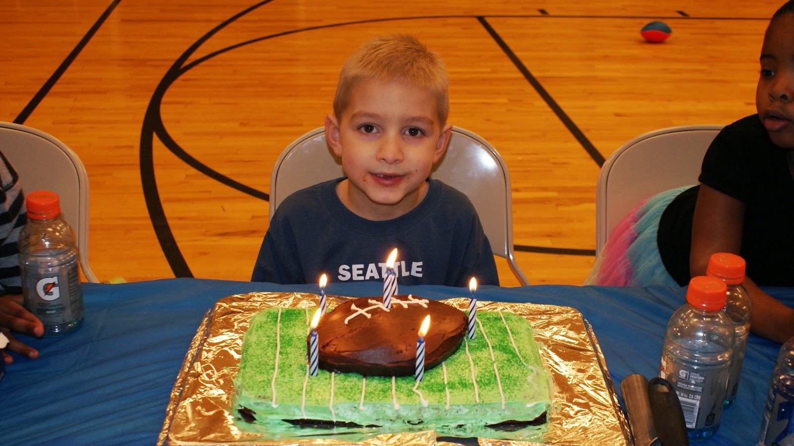 The weather was crummy so we went to the church and used the gym. We started with pin-the-ball in the field goal, then to a team cheer, stretches and warm ups, and then super bowl training. They had to jump over the boxes, sit on a balloon to pop it, kick a football, run in figure 8s between the bottles, and throw a football into the hula hoop. Everyone had a fun time, and of course got a super bowl ring at the end (ring pop). I was so glad for Jinni's help! Then we had hotdogs and chips for lunch, an awesome cake and ice cream, and opened presents. He got lots of fun sporty things and had a great time! After we played in the gym for a while and wore them all out, I dropped them off at school in time for kindergarten.